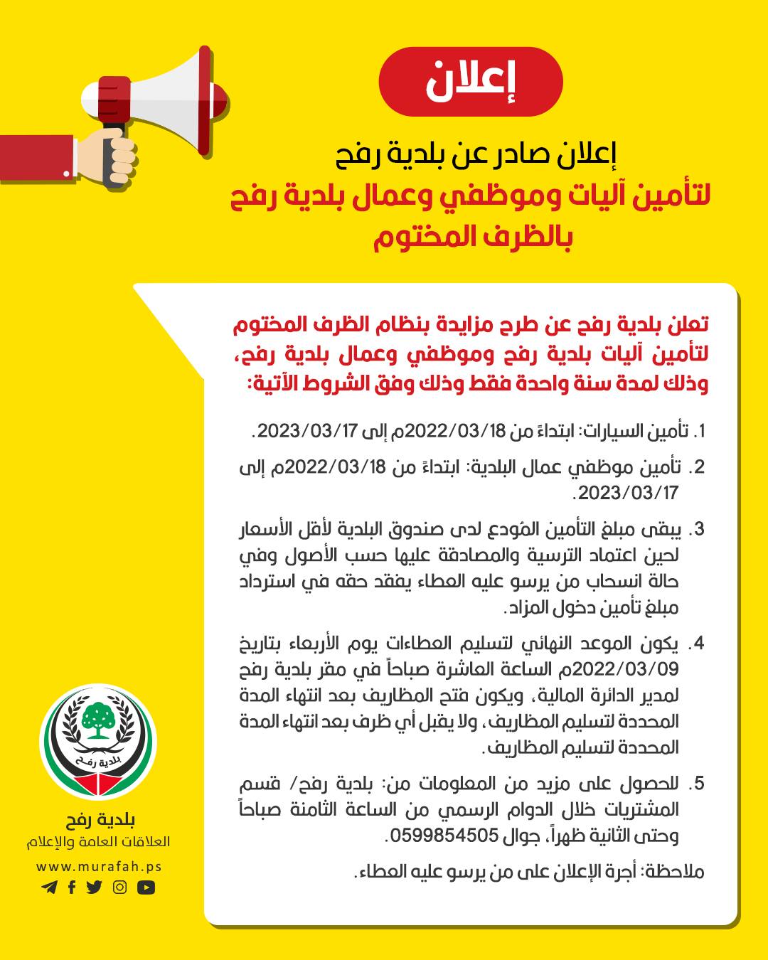 إعلان صادر عن بلدية رفح لتأمين آليات وموظفي وعمال بلدية رفح بالظرف المختوم.