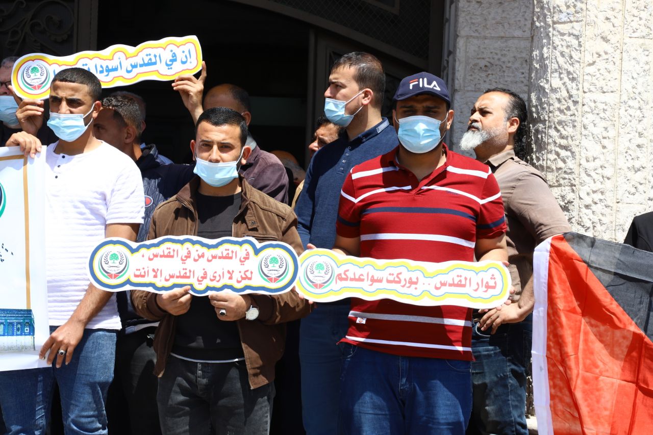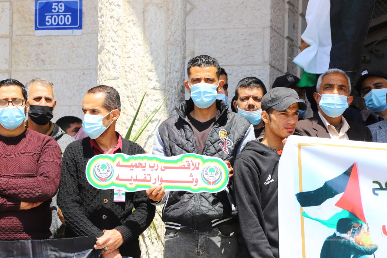 وأوضح د. الصوفي أن الوقفة هي رسالة دعم ومساندة من كافة طواقم البلدية لمؤازرة أهالي القدس وثوارها، وتأكيدًا على أن القدس هي الخط الأحمر للكل الفلسطيني.