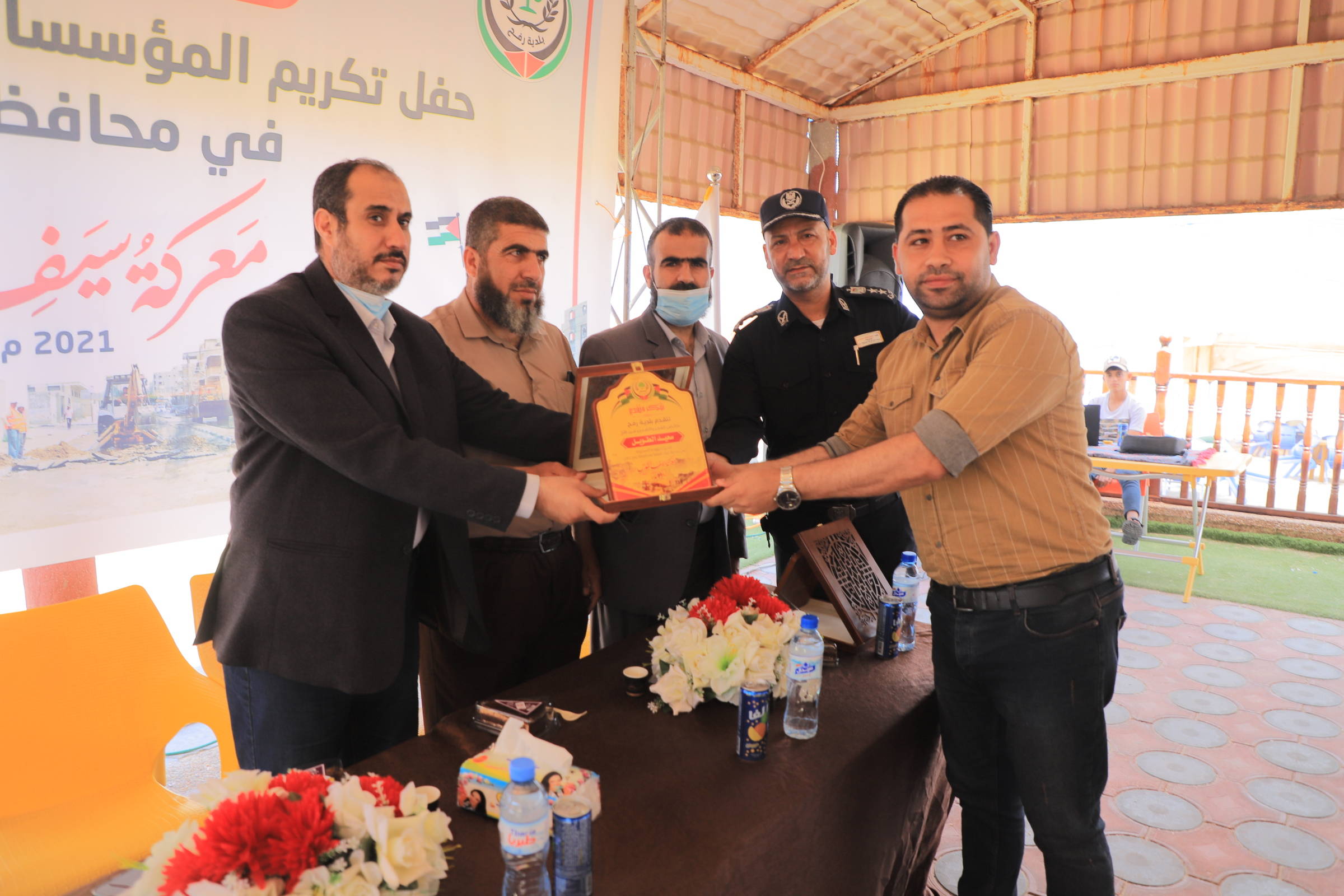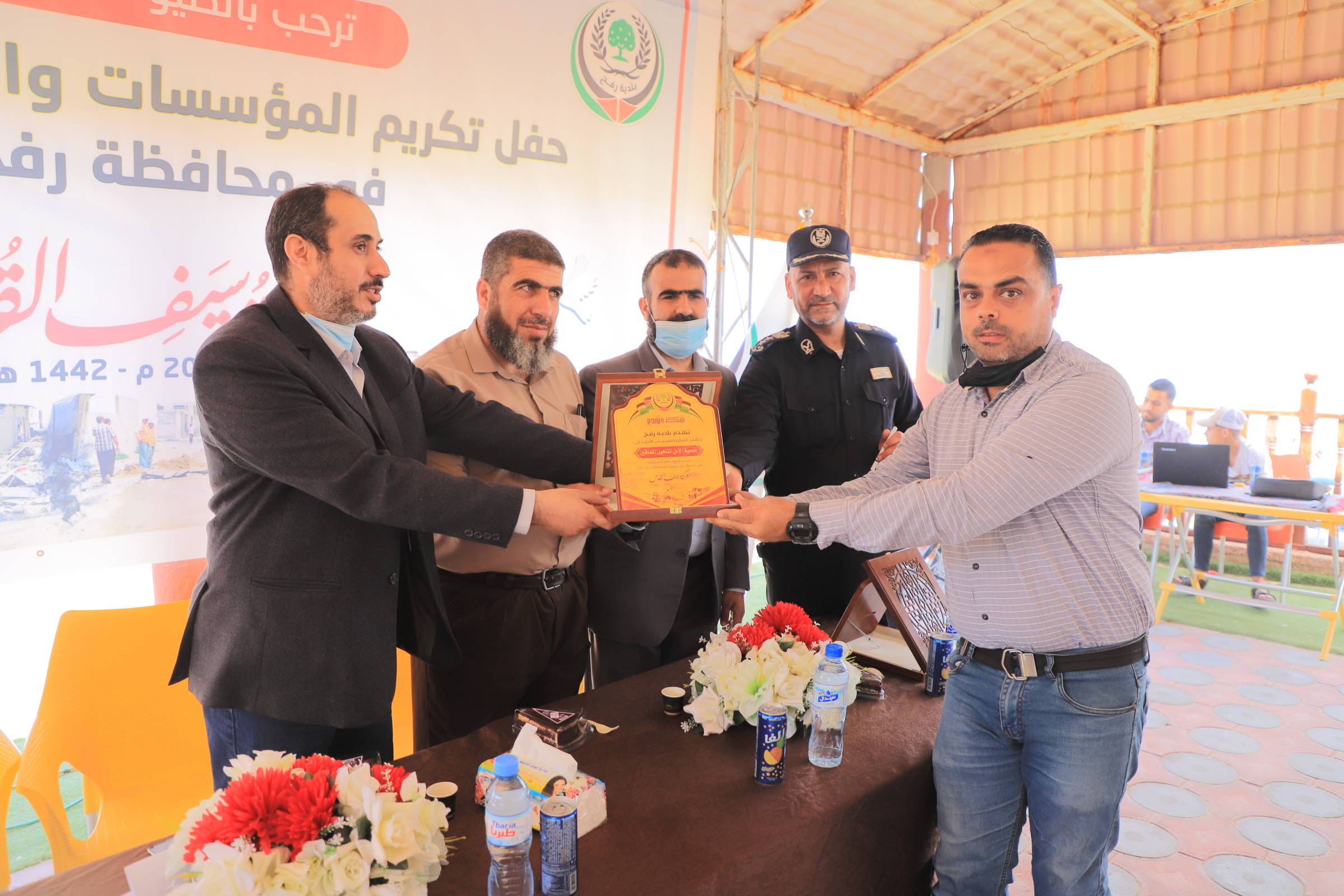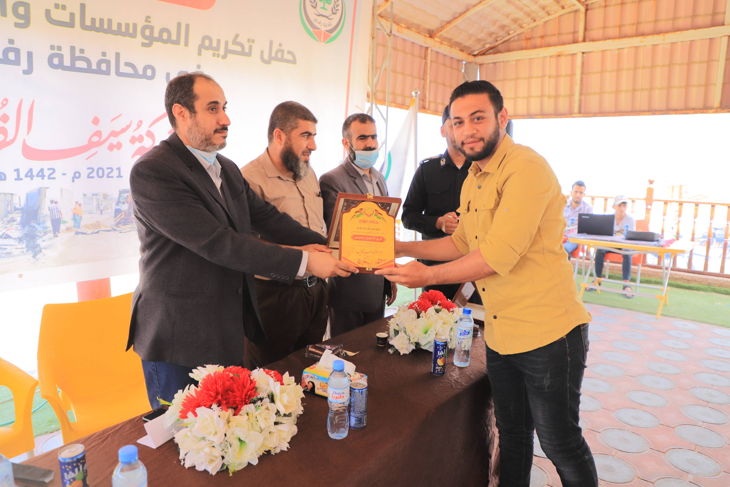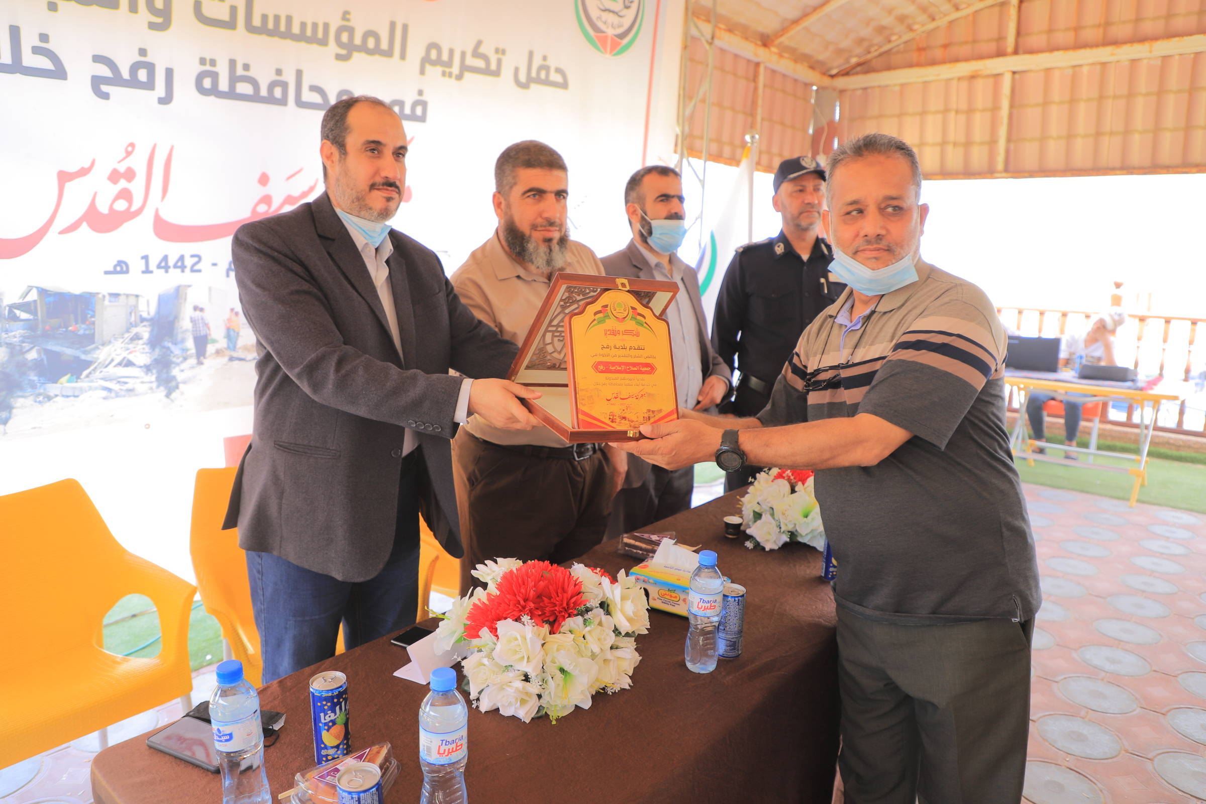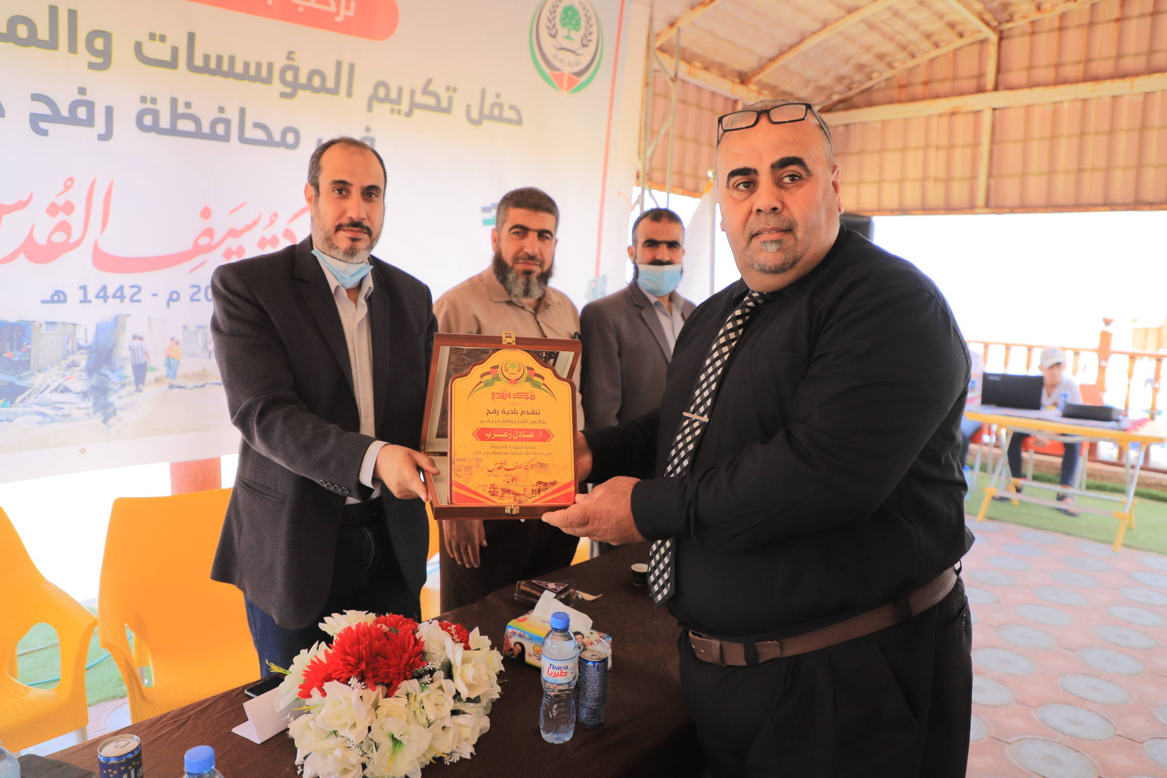 وفي ختام الحفل تم توزيع دروع شكر على كافة المؤسسات والمبادرات العاملة في محافظة رفح خلال معركة سيف القدس.