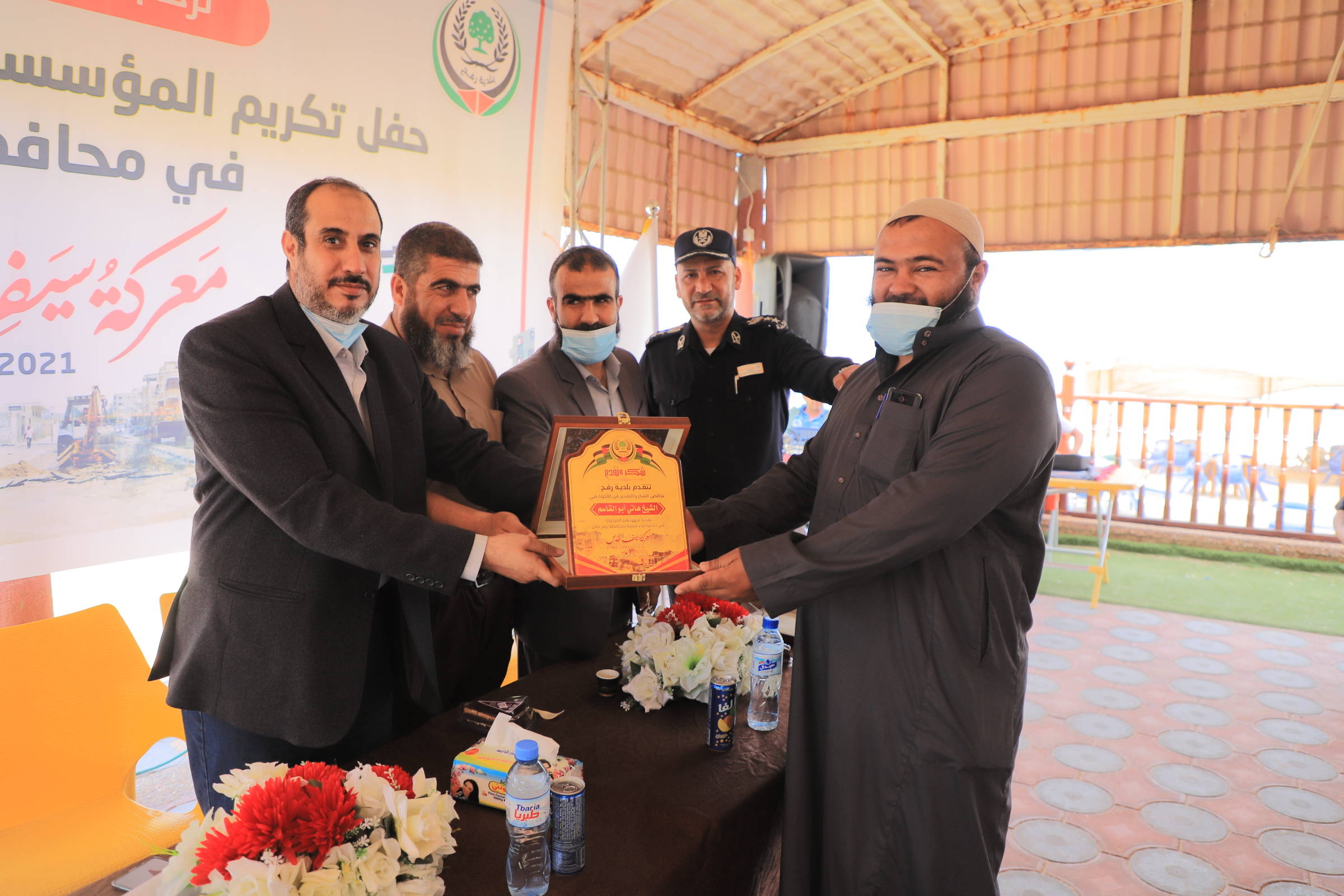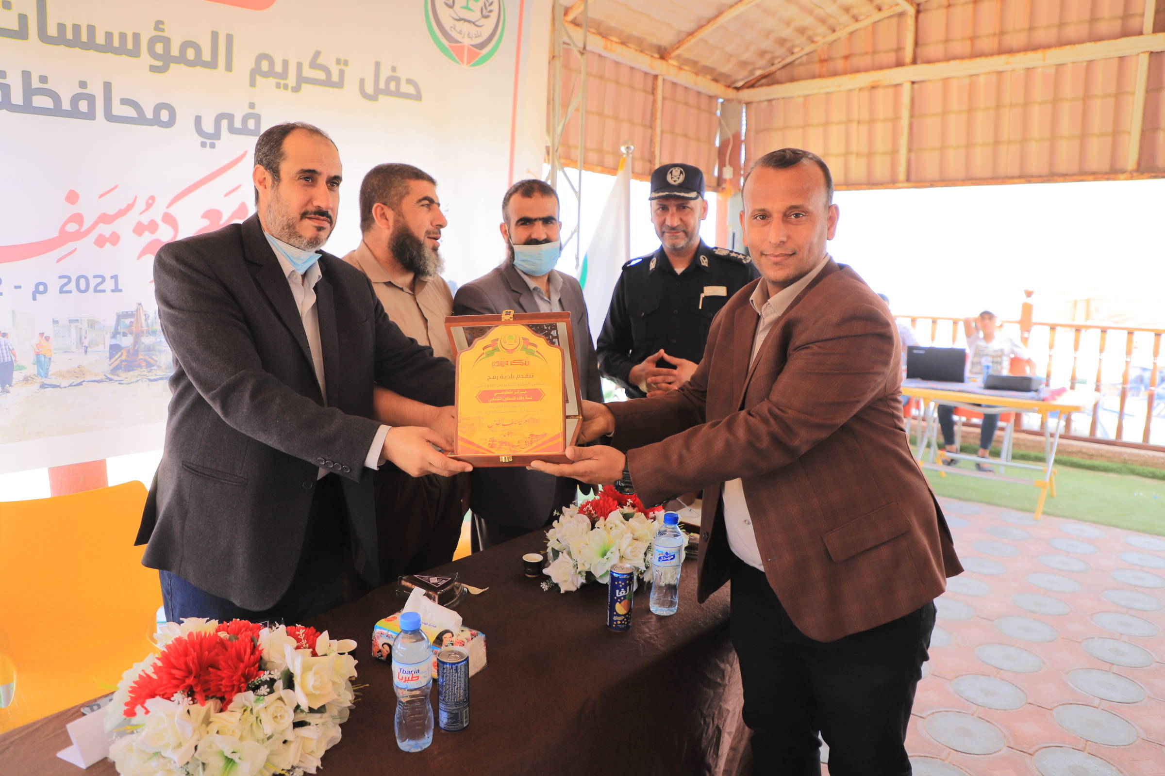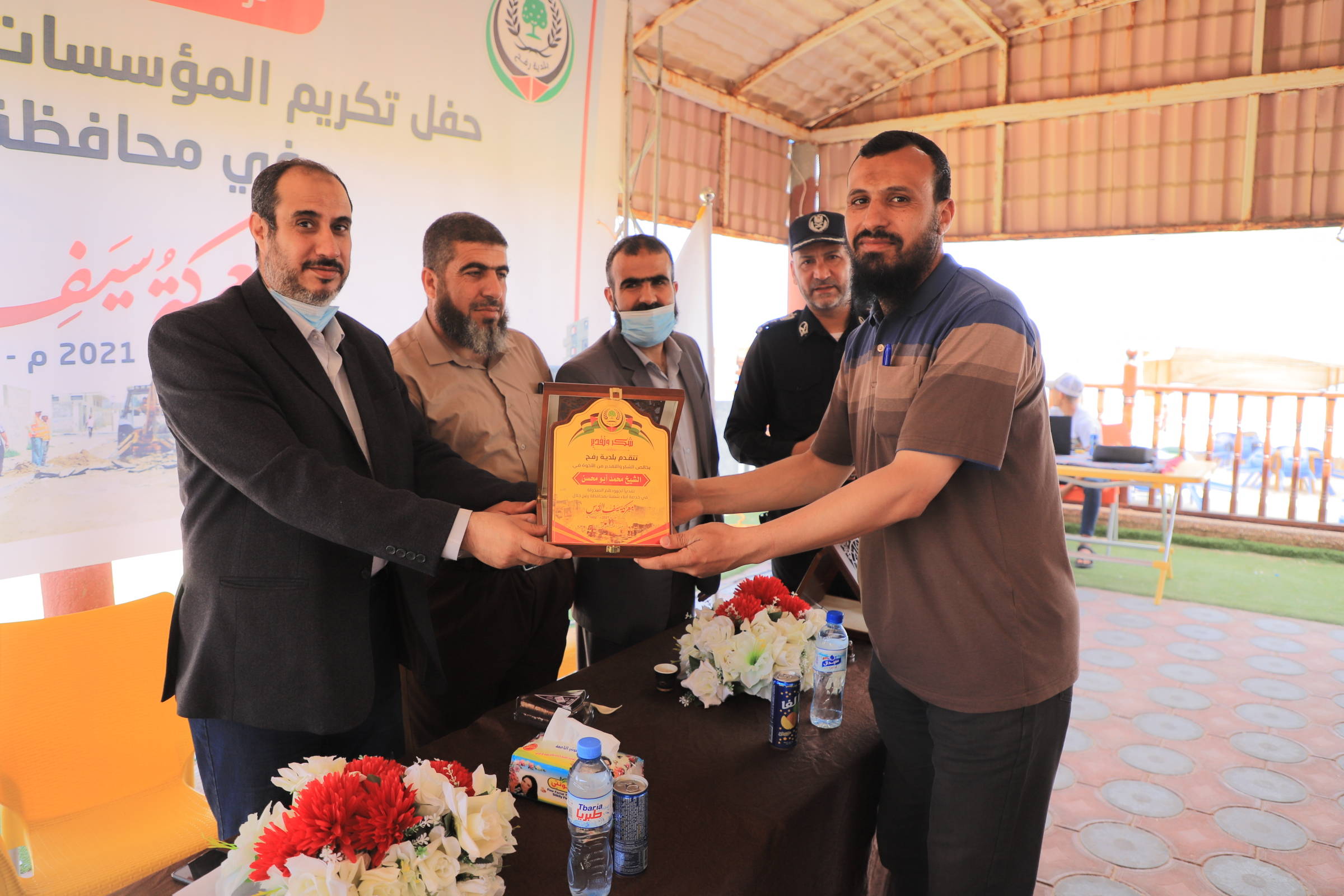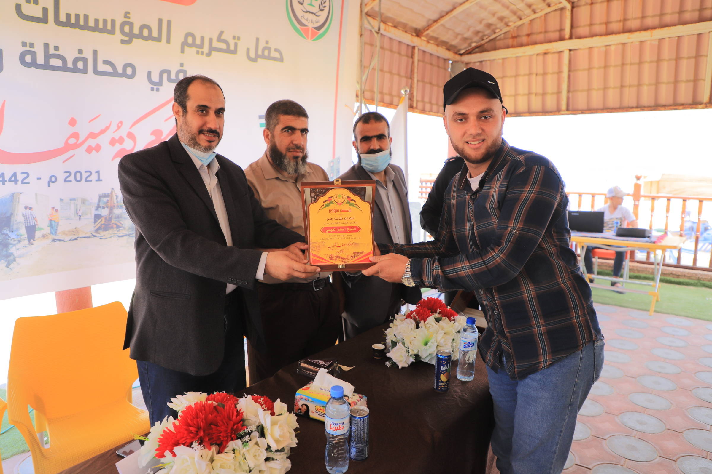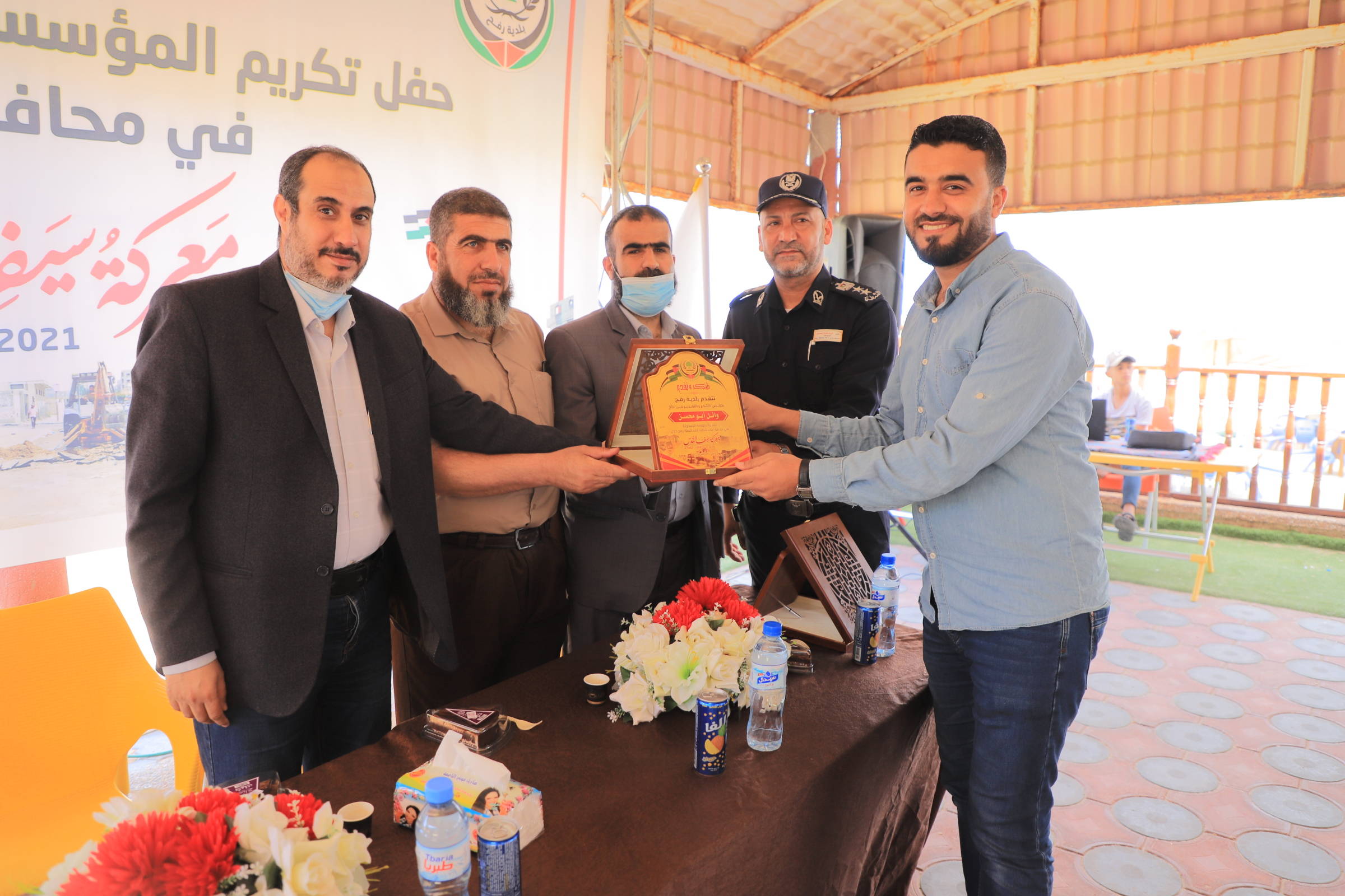 وفي ختام الحفل تم توزيع دروع شكر على كافة المؤسسات والمبادرات العاملة في محافظة رفح خلال معركة سيف القدس.